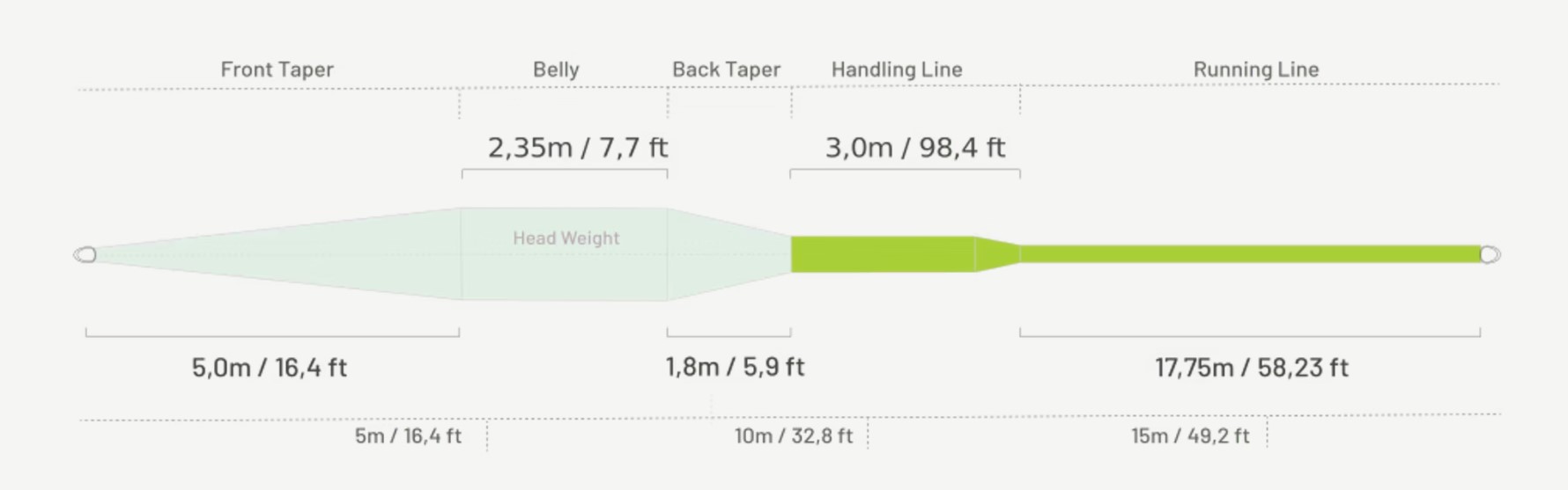 It has a 1,8 m / 5.9’ back taper that is long enough to stabilize at long range and yet, still short enough to make the line highly suitable for spey casts. The back taper transforms into a comfortable 3.0 meters long ”handling line” before the thinner shooting line kicks in.